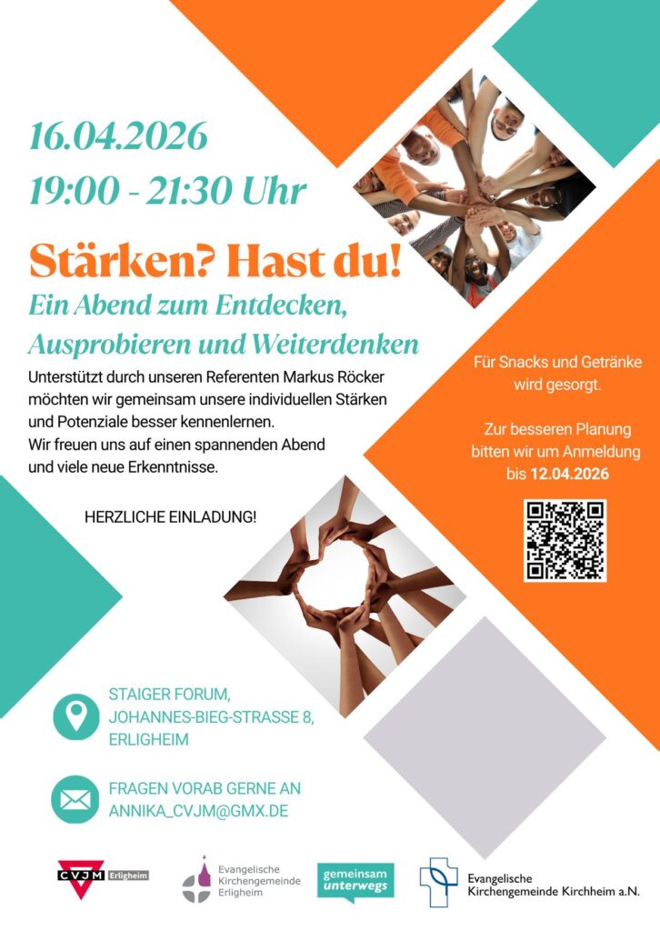 Am 16.04.2026 findet von 19:00 – 21:30 Uhr im Staiger Forum in Erligheim ein Abend mit Markus Röcker statt. Er ist Landesjugendreferent im Landesjugendwerk in Stuttgart. Gemeinsam mit ihm wollen wir entdecken, ausprobieren und weiterdenken, unsere individuellen Stärken und Potentiale kennenlernen. Wir freuen uns auf einen spannenden Abend mit vielen neuen Erkenntnissen – und auf besonders auf DICH! Komm vorbei
