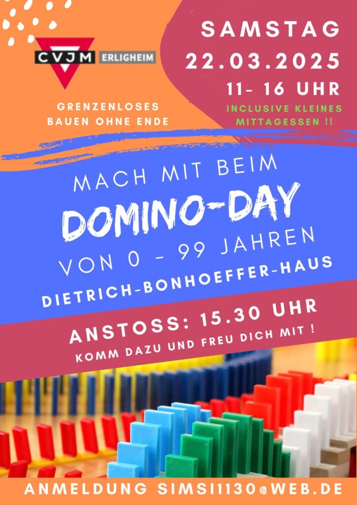 Herzliche Einladung zum 4. Domino-Day. Wieder mal an einem Samstag. Am 22.3. starten wir um 11.00 Uhr mit dem Aufbau der Domino-Steine in verschiedenen Gruppen. Ab 12.00 Uhr gibt es einen Snack und um 15.30 Uhr laden wir alle Interessierten zum gemeinsamen Anstoß der Steine ein. Wir freuen uns auf Kinder, Jugendliche, Eltern mit Kindern, Großeltern, alle, die Freude haben am gemeinsamen Aufbauen.