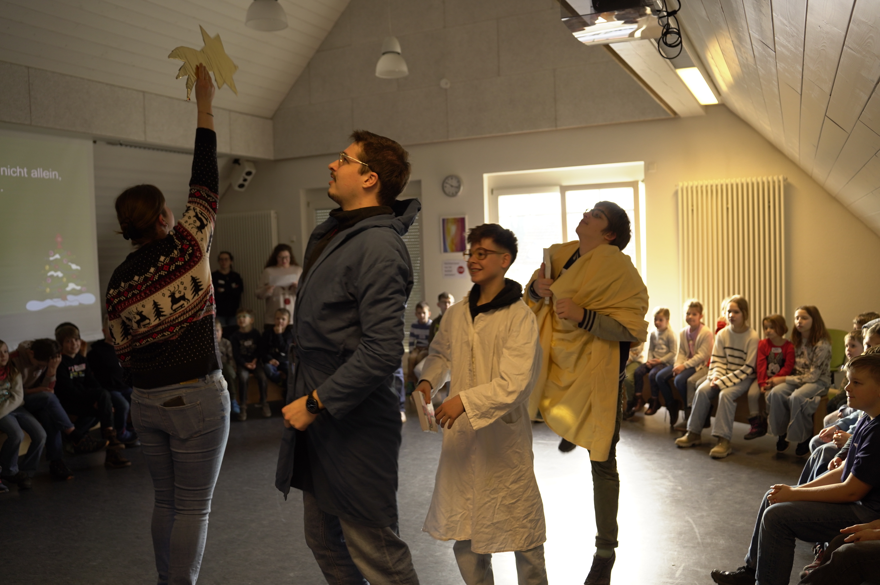 Von 9.30 bis 12.30 Uhr waren diesmal überwältigende 62 Kinder im Dietrich-Bonhoeffer-Haus.Nach dem Ankommen starteten wir gemeinsam im Plenum. Mit Singen, gemeinsamen Spiel, einem Anspiel: von drei Freunden, die einem Stern folgen und Jesus finden.